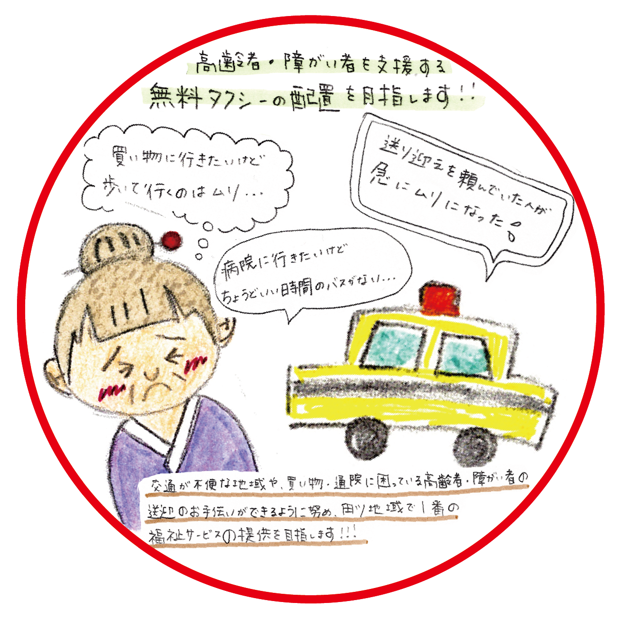 高齢者・障がい者を支援する無料タクシーの配備を目指します。